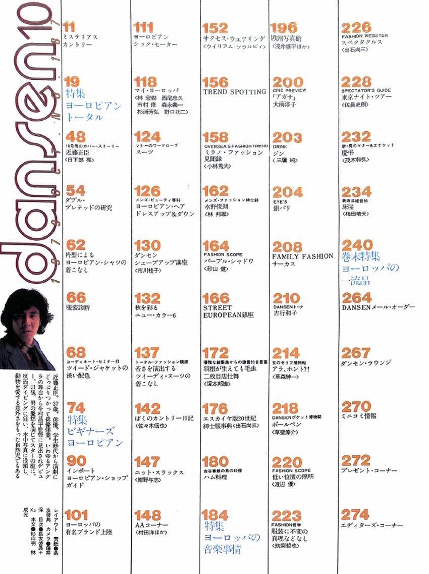 特集 ヨーロピアン トータル / ミステリアス カントリー / 10月号のカバー・ストーリー 近藤正臣 / ダブル・ブレテッドの研究 / 衿型によるヨーロピアン・シャツの着こなし / 服装診断 / ツイード・ジャケットの渋い配色 / 特集 ビギナーズ ヨーロピアン / インポート ヨーロピアン・ショップ ガイド / ヨーロッパの有名ブランド上陸 / マイ・ヨーロッパ / 秋を彩るニュー・カラー6 / ぼくのカントリー日記 佐々木信也 / ニット・スラックス / ミラノ・ファッション見聞録 / FASHION SCOPE パーブル・シャドウ / STREET EUROPEAN 銀座 / 古谷春夫雄の男の料理 ハム料理 / 特集 ヨーロッパの音楽事情 / 欧州写真館 / EYE'S 銀パリ / DANSENトーク 吉行和子 / FASHION哲学 筑紫哲也 / 東京ナイト・ツアー / 巻末特集 ヨーロッパの一流品 / 他 ・・・目次より