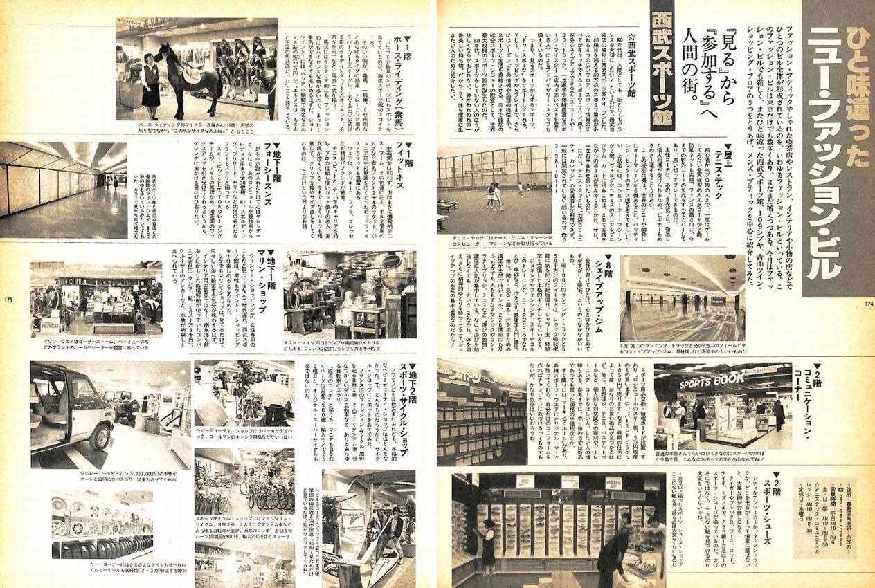 ファッション・ブティックやしゃれた喫茶店やレストラン、インテリアや小物の店などでひとつのビル全体が形成されているのを、いわゆるファッション・ビルといっている。このフォッション・ビルは東京だけでも数多くあり、まだまだ増えつつある。今月はファッション・ビルでも新しく、またひと味違った西武スポート館、109シブヤ、青山ツイン・ショッピング・フロアの 3つをとりあげ、メンズ・ブテックを中心に紹介してみた。